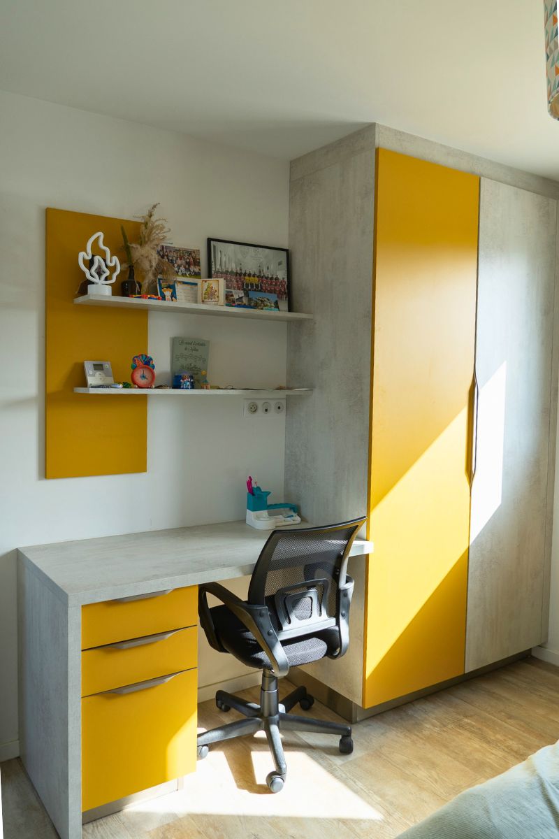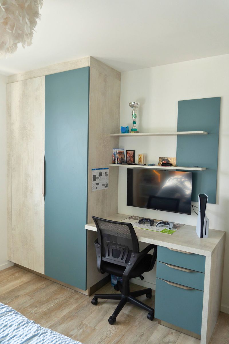 Pour cette réalisation, nous avons conçu un aménagement complet intégrant bureau et rangements, parfaitement adapté à l’espace et aux besoins du quotidien.