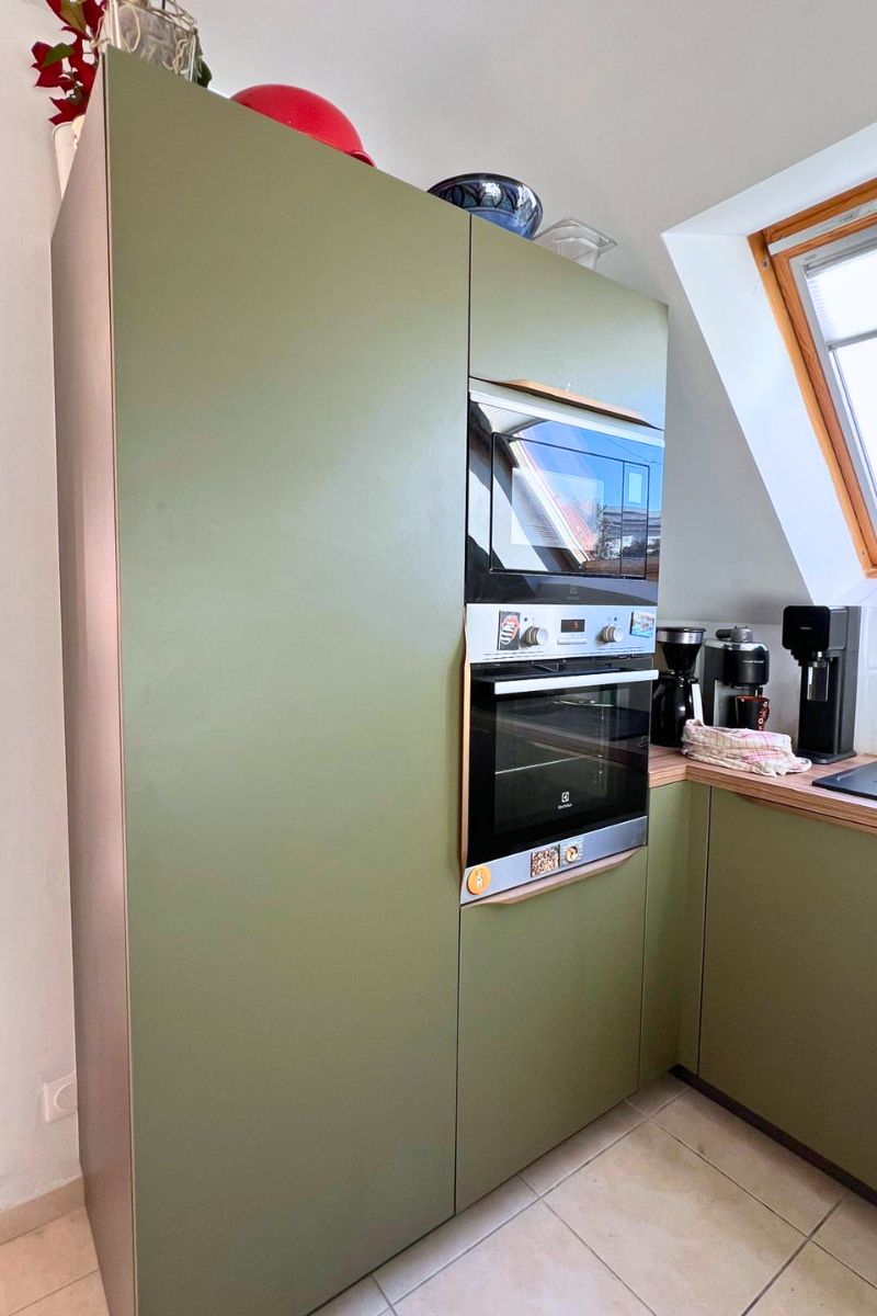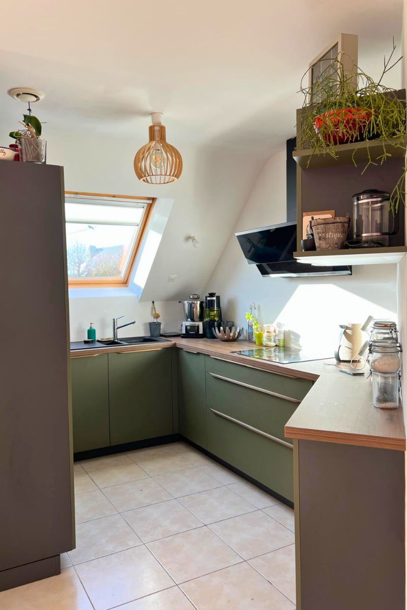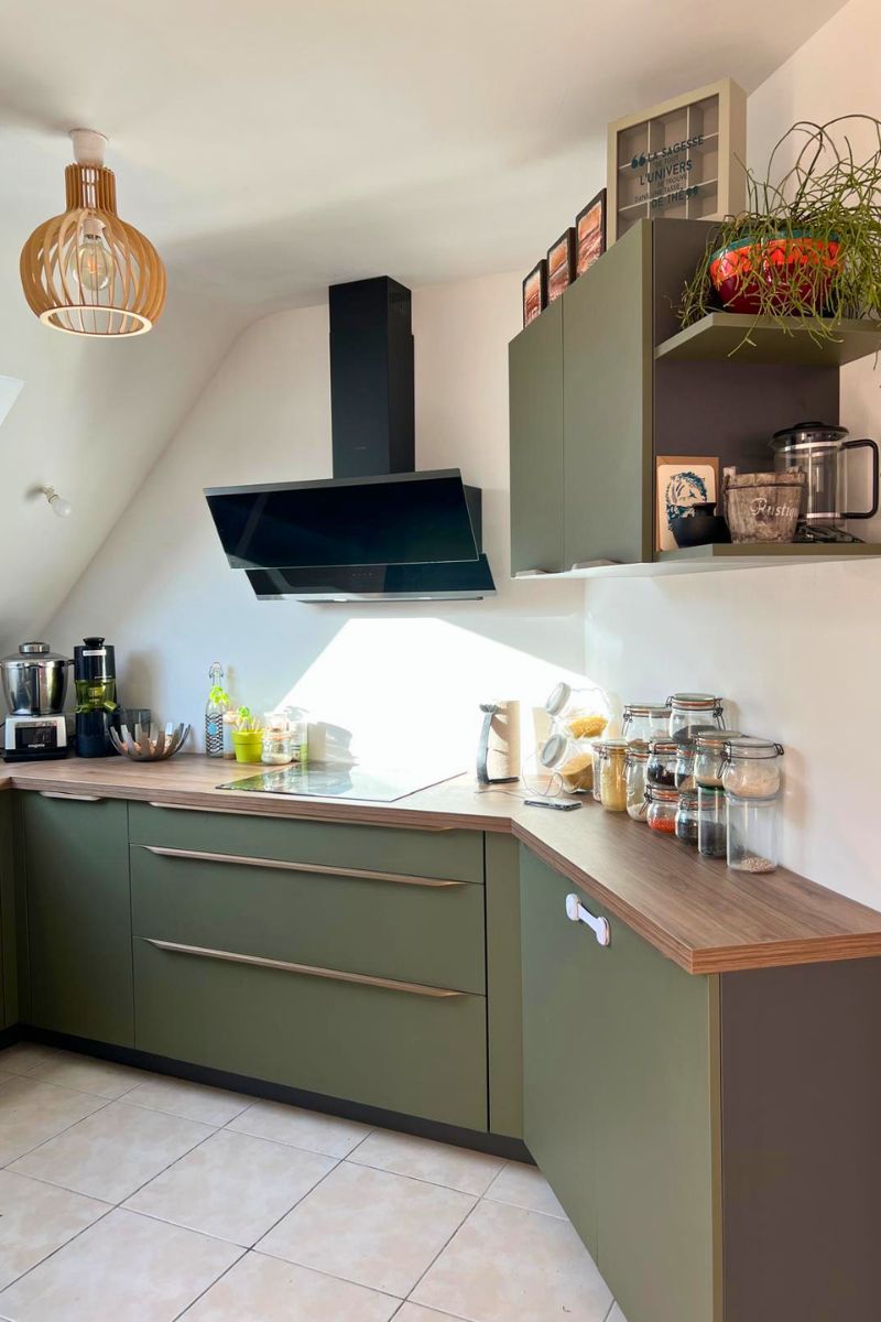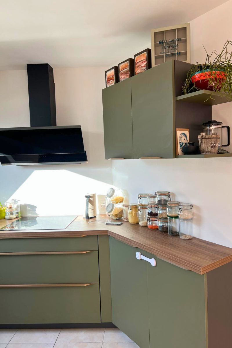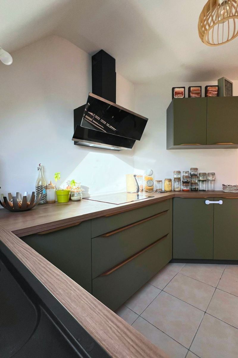 Les façades vert mat apportent du caractère et une touche naturelle à l’ensemble, tandis que le plan de travail effet bois vient réchauffer la pièce et créer une ambiance conviviale.