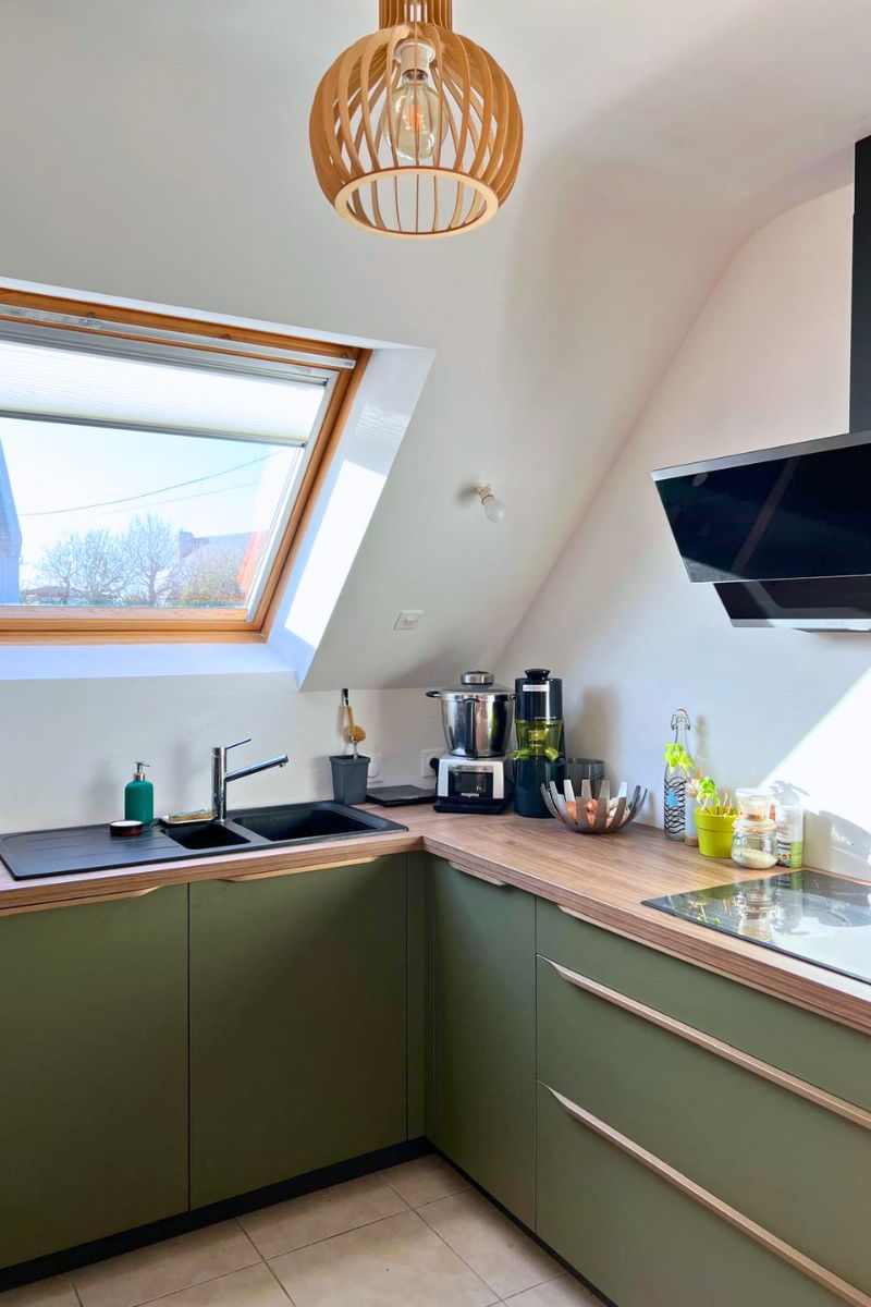 Pour cette réalisation à Brest, nous avons conçu une cuisine fonctionnelle et chaleureuse, parfaitement adaptée à un espace sous pente.