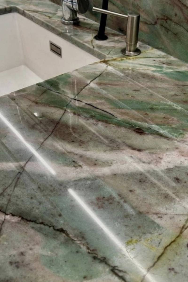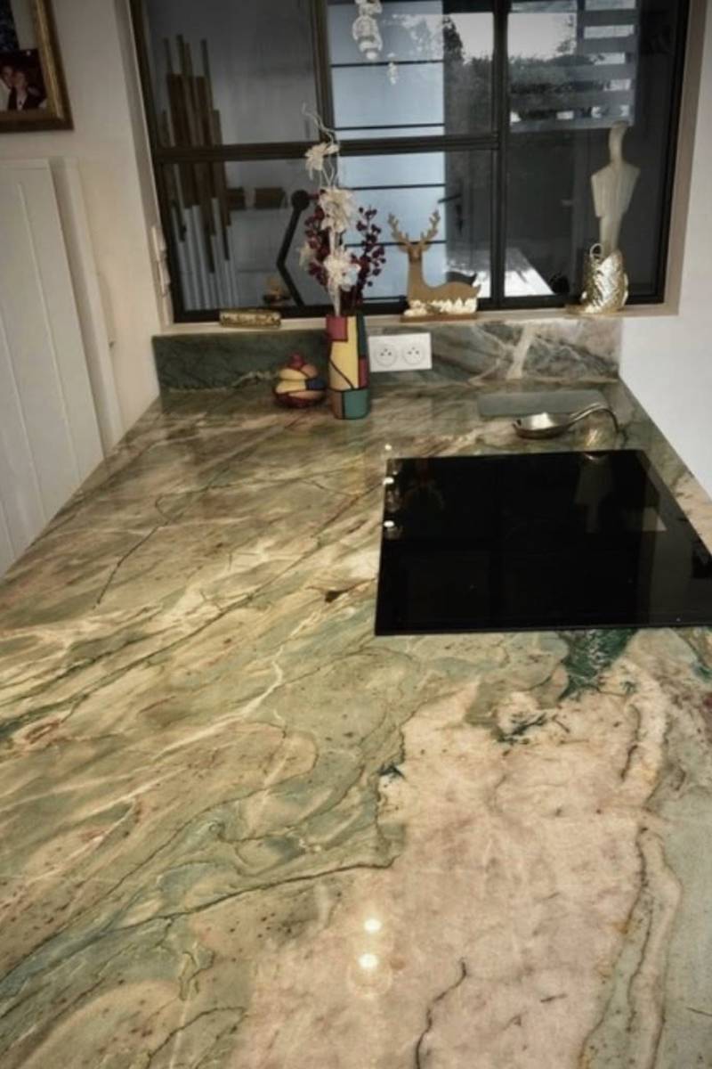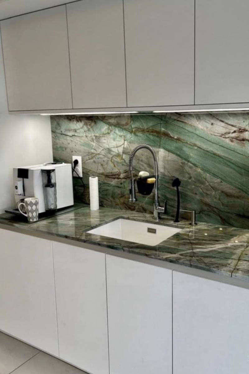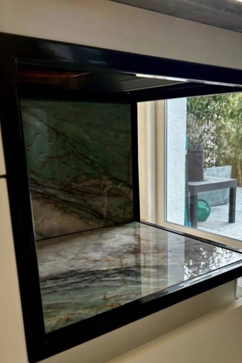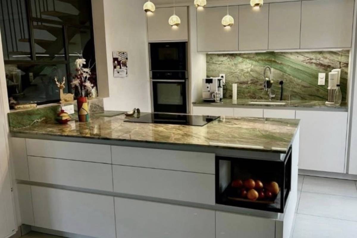 Le projet est sublimé par un granit Vesuvio poli de la marque Granit Evolution, dont la profondeur et les nuances naturelles apportent contraste et raffinement.