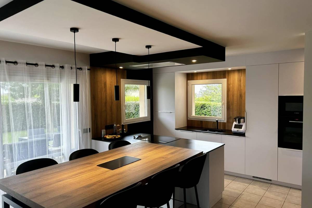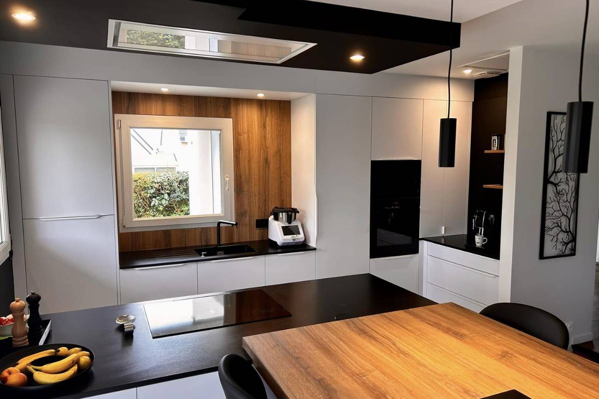 Le granit noir, profond et structurant, vient créer un contraste affirmé qui donne du caractère à la cuisine.