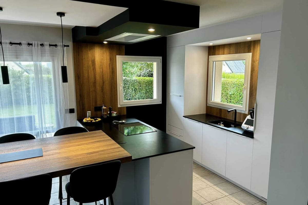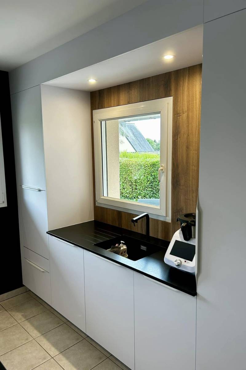 Pour ce projet réalisé sur la commune de Ploumoguer, nous avons travaillé autour d’une association élégante et intemporelle : blanc satiné, granit noir et touche de bois brun.