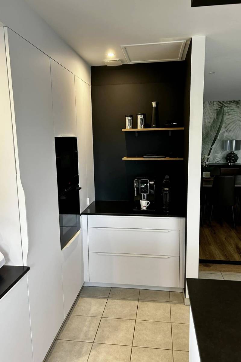 Les façades blanc satiné apportent luminosité et douceur à l’ensemble, tout en offrant une finition raffinée et contemporaine.