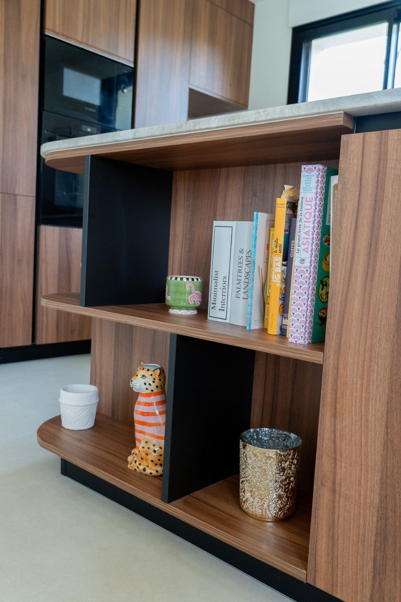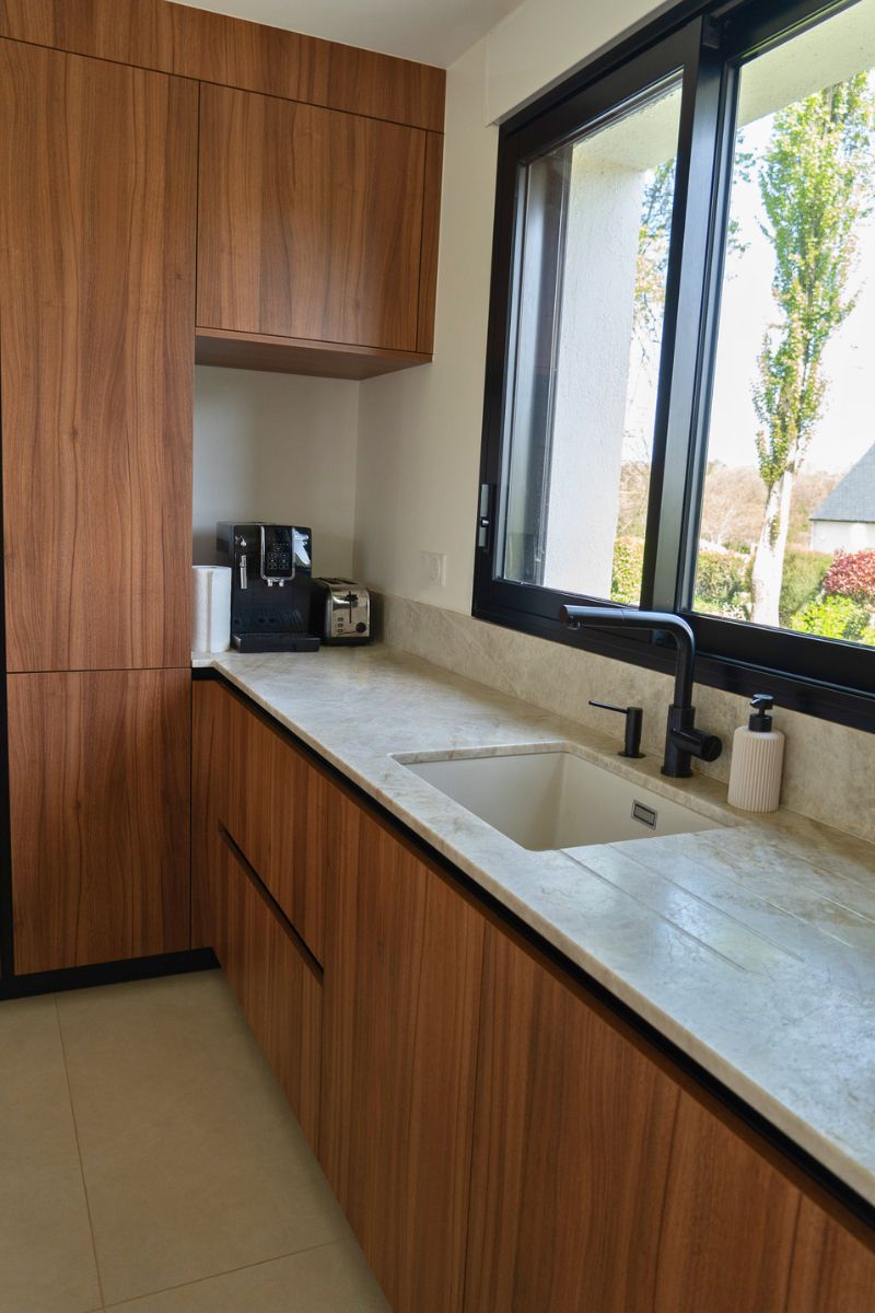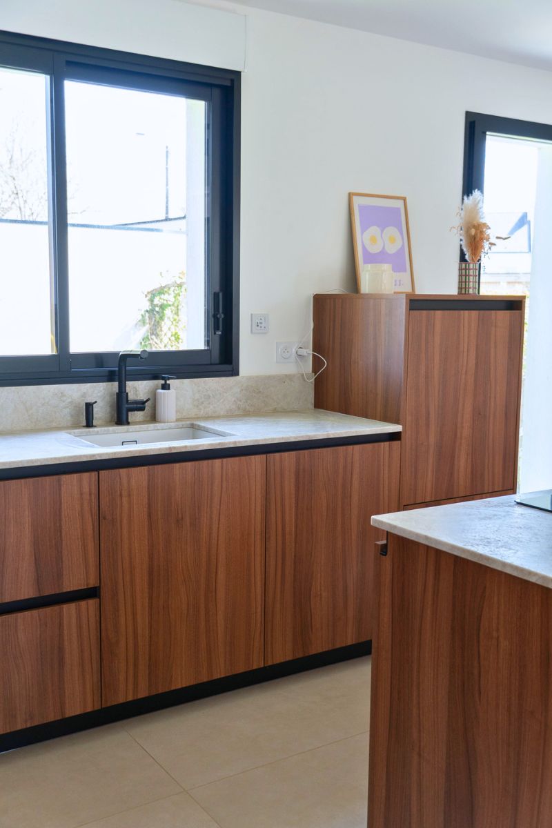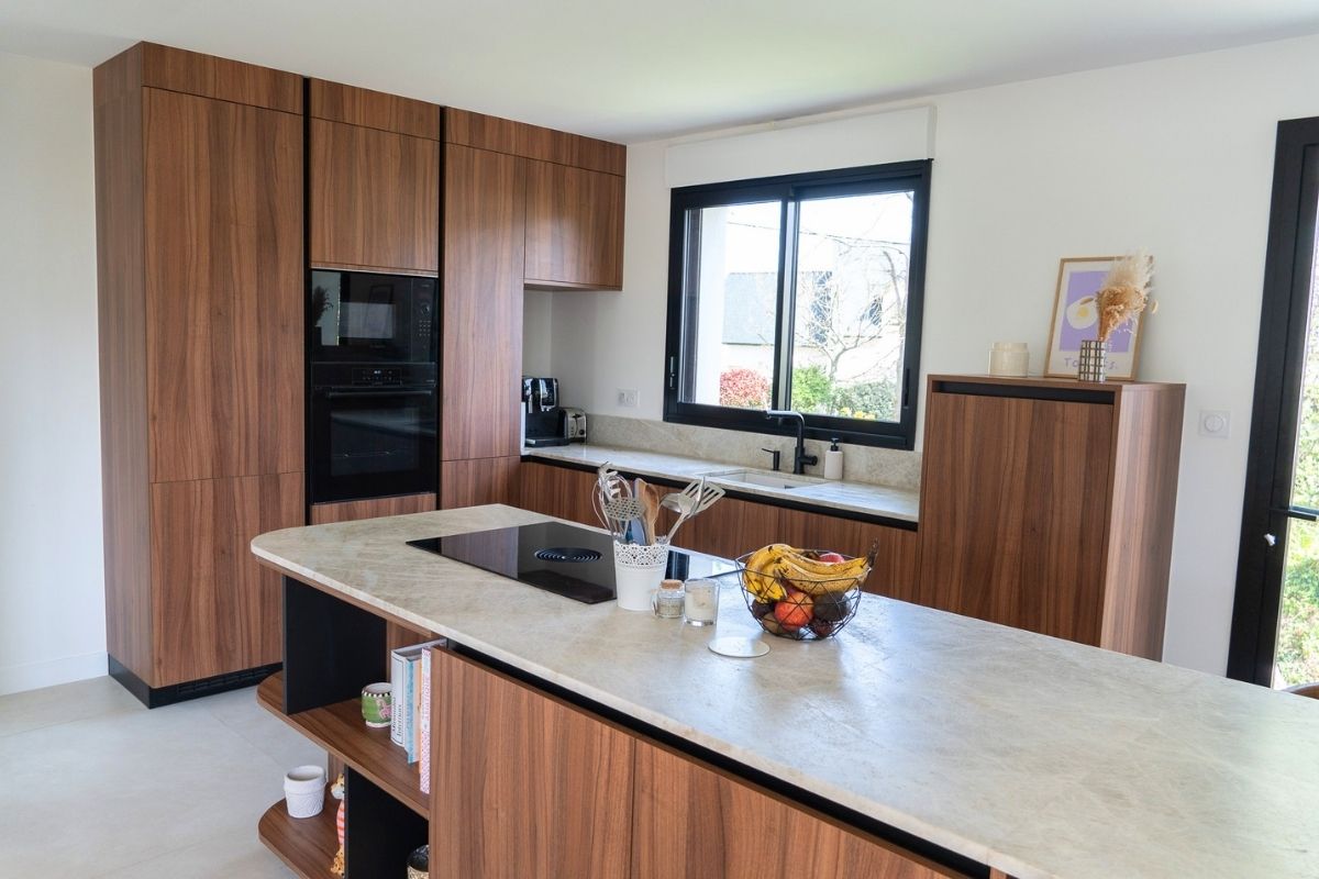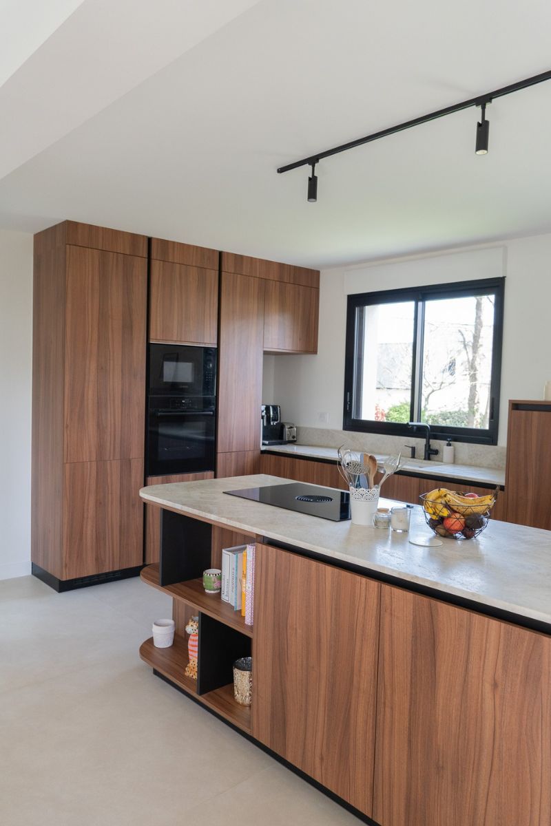 Les façades effet noyer de Bourgogne apportent profondeur et caractère, sublimées par une gorge noire qui souligne les lignes épurées de l’ensemble.