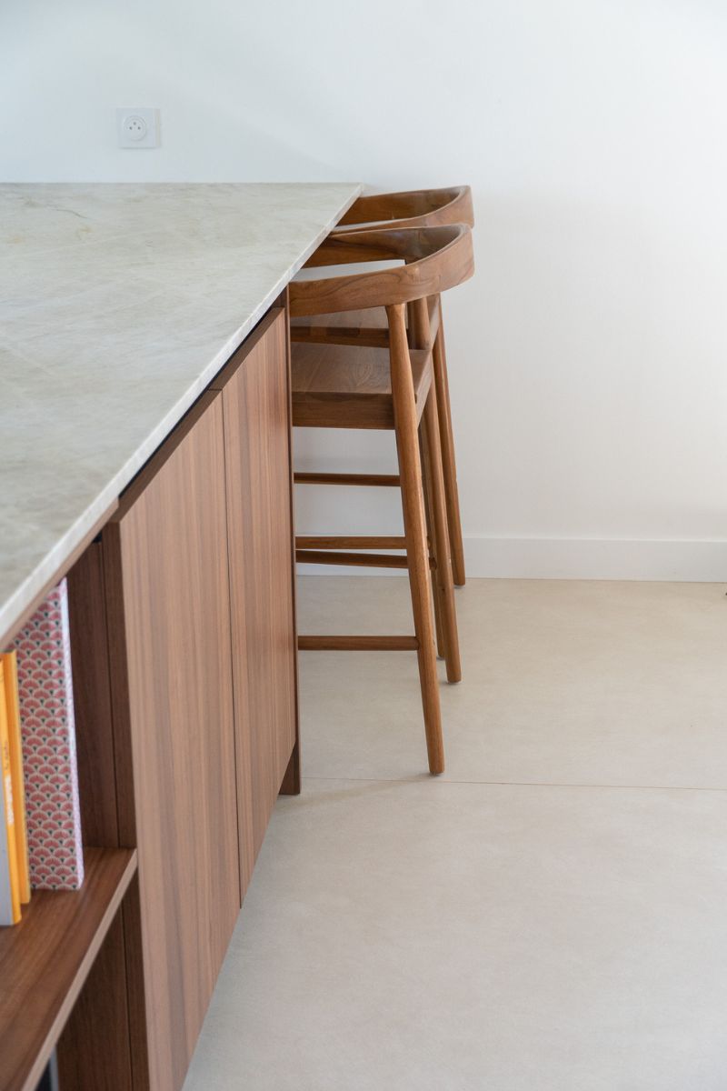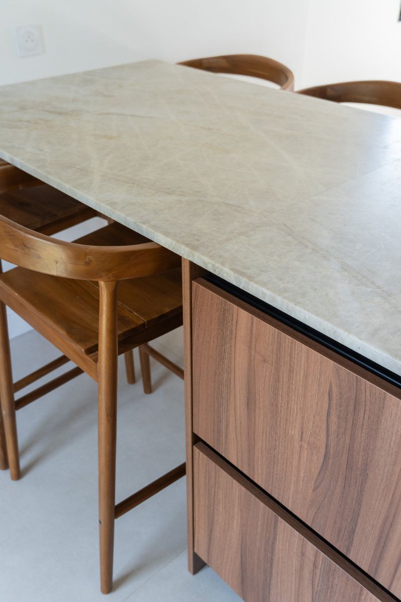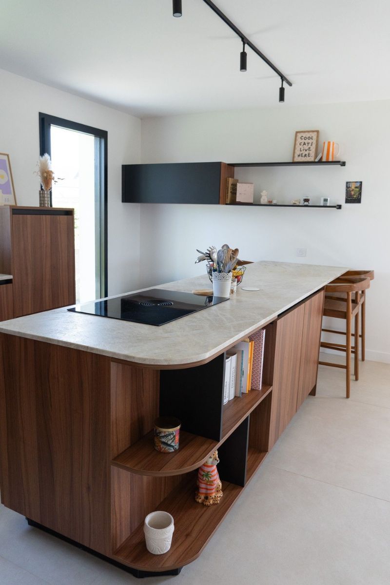Pour cette réalisation, nous avons conçu une cuisine au style chaleureux et contemporain, mettant en valeur des matériaux nobles et des finitions soignées.