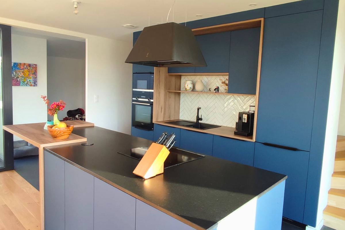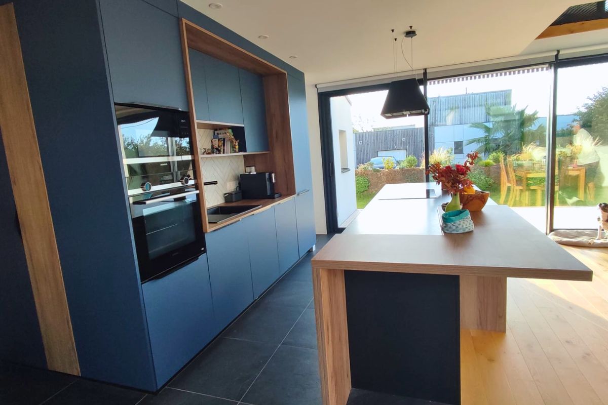 Les façades bleues mates apportent profondeur et modernité, tandis que les encadrements et éléments en bois naturel viennent structurer l’espace et créer un contraste chaleureux.