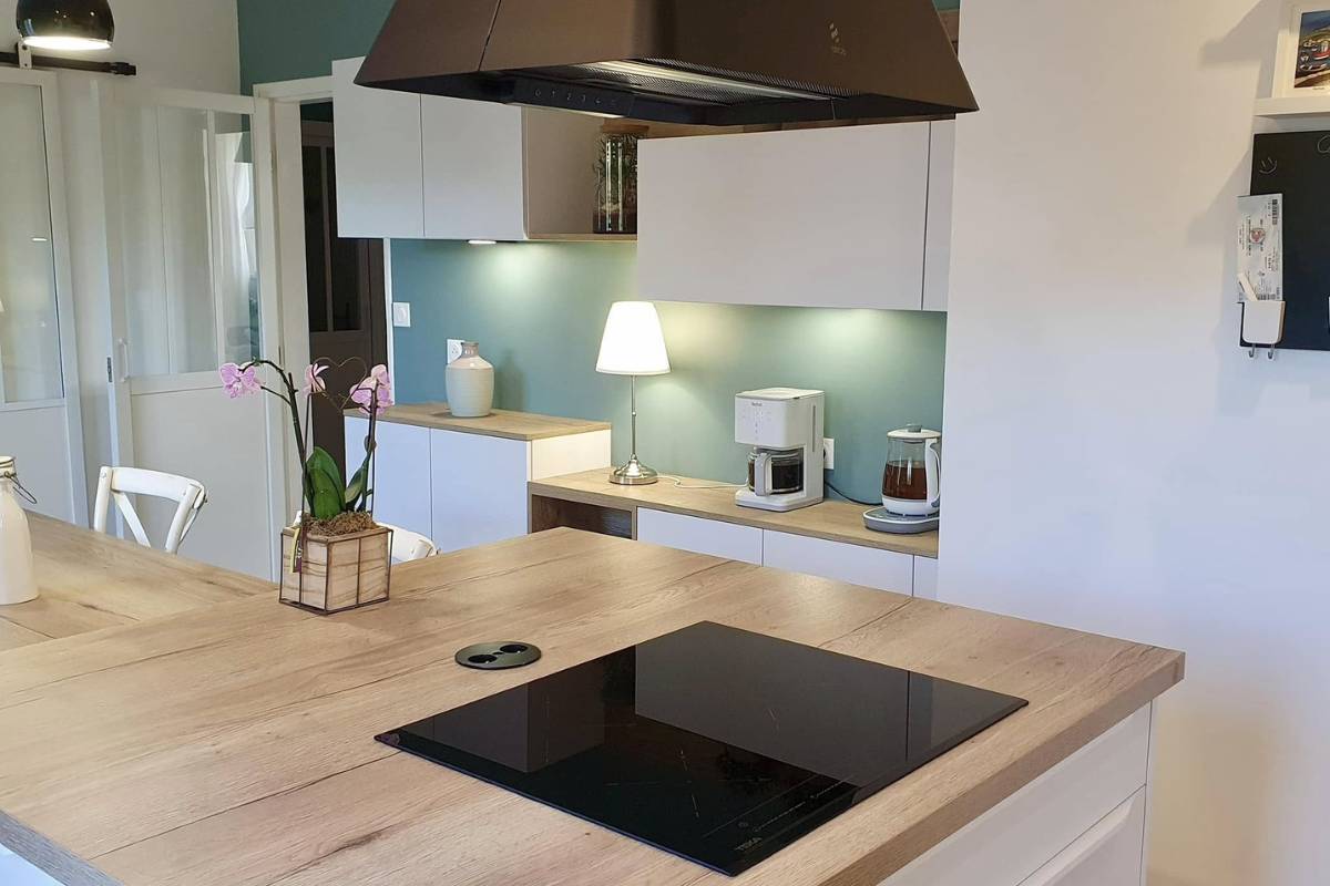 Les façades blanches apportent luminosité et douceur à l’ensemble, tandis que les touches de bois viennent réchauffer l’espace et structurer visuellement la cuisine.