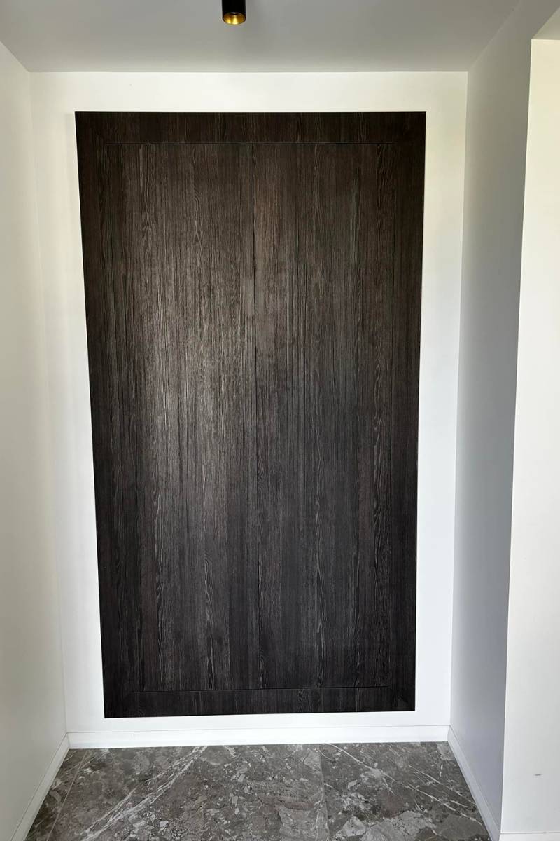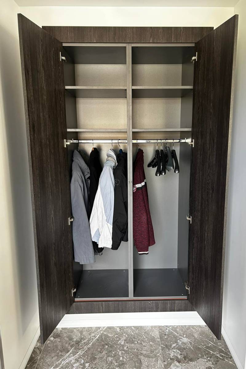 Au-delà de l’esthétique, ce placard a été pensé pour optimiser le rangement du quotidien : vestiaire, chaussures et accessoires trouvent naturellement leur place dans un ensemble parfaitement intégré à l’espace.