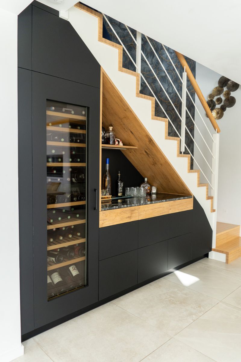 Le meuble sous escalier associe des façades noires mates à des touches de bois naturel, créant un contraste élégant et contemporain.
